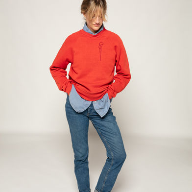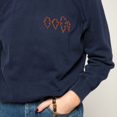 Each selected drawing is translated into embroidery and stitched carefully onto vintage pieces. The process is slow and intentional: choosing the design, thread color, and placement with as much consideration as Kelly gave to his line.